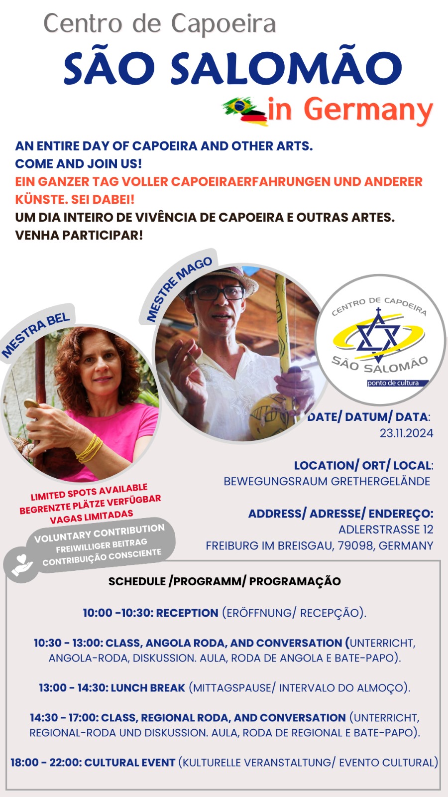Am 23. November bringt das Kollektiv Monifá die Capoeira-Gruppe São Salomão zusammen mit dem Monifá-Soiree nach Freiburg unter dem Thema "black consciousness". Es wird ein ganzer Tag sein, an dem afrobrasilianische Kultur erlebt werden kann. Den gesamten Zeitplan und zur Registrierung, um teilnehmen zu können, gelangt man unter dem Link unten.