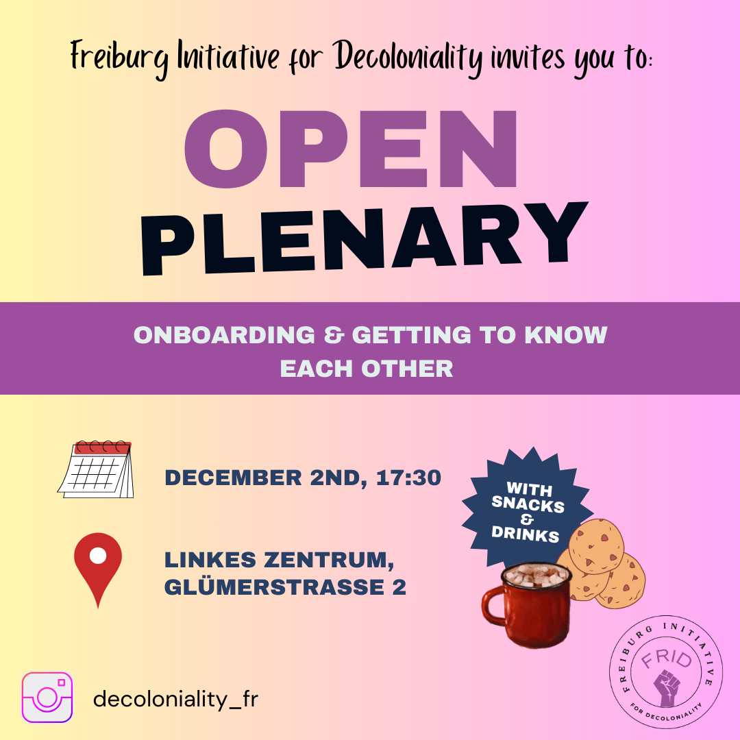 Join us for our open plenary. If you want to learn more about (de-)coloniality, our past and future events and you are thinking of joining a political group - we are looking forward to get to know you!