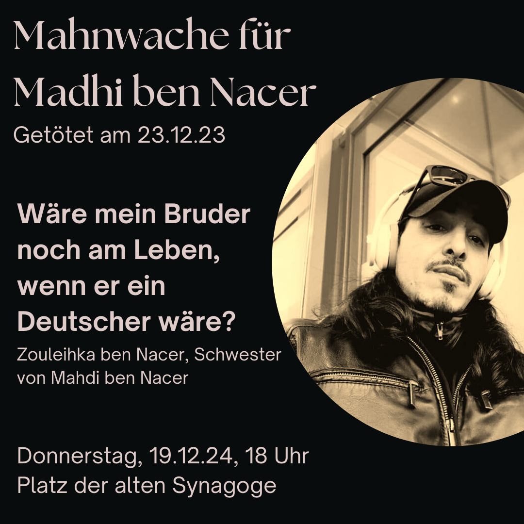 Wir möchten heute zusammen Mahdi ben Nacer Gedenken und damit seiner Familie eine Botschaft der Solidarität senden.