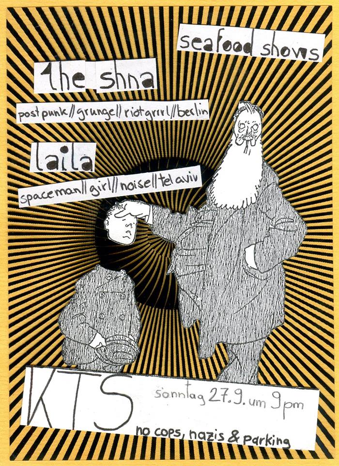 Laila sind ebenfalls zu zweit, jedoch aus Tel Aviv. Düster und laut gefallen ihnen Bands wie Die Nerven und ja: die liegen blank unter einer feinen Schicht aus Eis. Poppig und wavig werden sie den kleinen Raum total zerrumpeln. Außerdem finden sie es gut, wenn Leute zeitig zur show kommen. Genauso wie die Spießer von seafood shows.