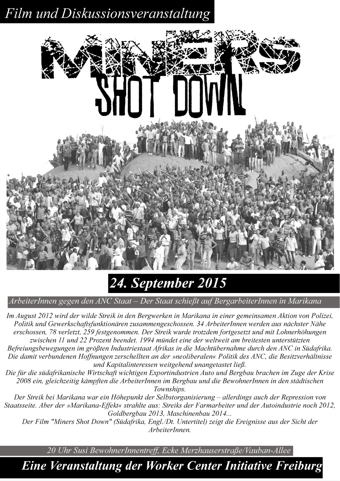 Der Streik bei Marikana war ein Höhepunkt der Selbstorganisierung – allerdings auch der Repression von Staatsseite. Aber der »Marikana-Effekt« strahlte aus: Streiks der Farmarbeiter und der Autoindustrie noch 2012, Goldbergbau 2013, Maschinenbau 2014... Der Film "Miners Shot Down" (Südafrika, Engl./Dt. Untertitel) zeigt die Ereignisse aus der Sicht der ArbeiterInnen.