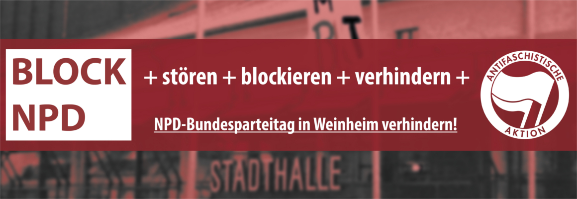 Am 21. und 22. November soll zum dritten Mal in Folge der Bundesparteitag der NPD in Weinheim stattfinden. Hierzu werden Nazis aus dem gesamten Bundesgebiet anreisen. Das Bündnis „Block NPD“ (http://blocknpd2015.blogsport.de) ruft dazu auf den diesjährigen Parteitag durch vielfältige und entschlossene antifaschistische Proteste zu verhindern.