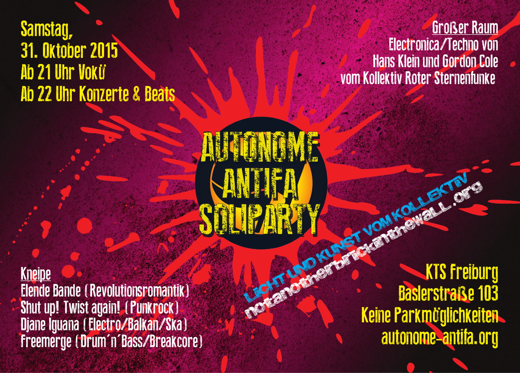 Am Samstag, den 31. Oktober, feiern wir mit euch wieder die alljährliche Soliparty in der KTS Freiburg, um damit die antifaschistische Arbeit des nächsten Jahres zu finanzieren. Die Versorgung der Feierbedürftigen wird mit herbstlichem Essen, kühlen Getränken und richtig ordentlicher Musik gedeckt.