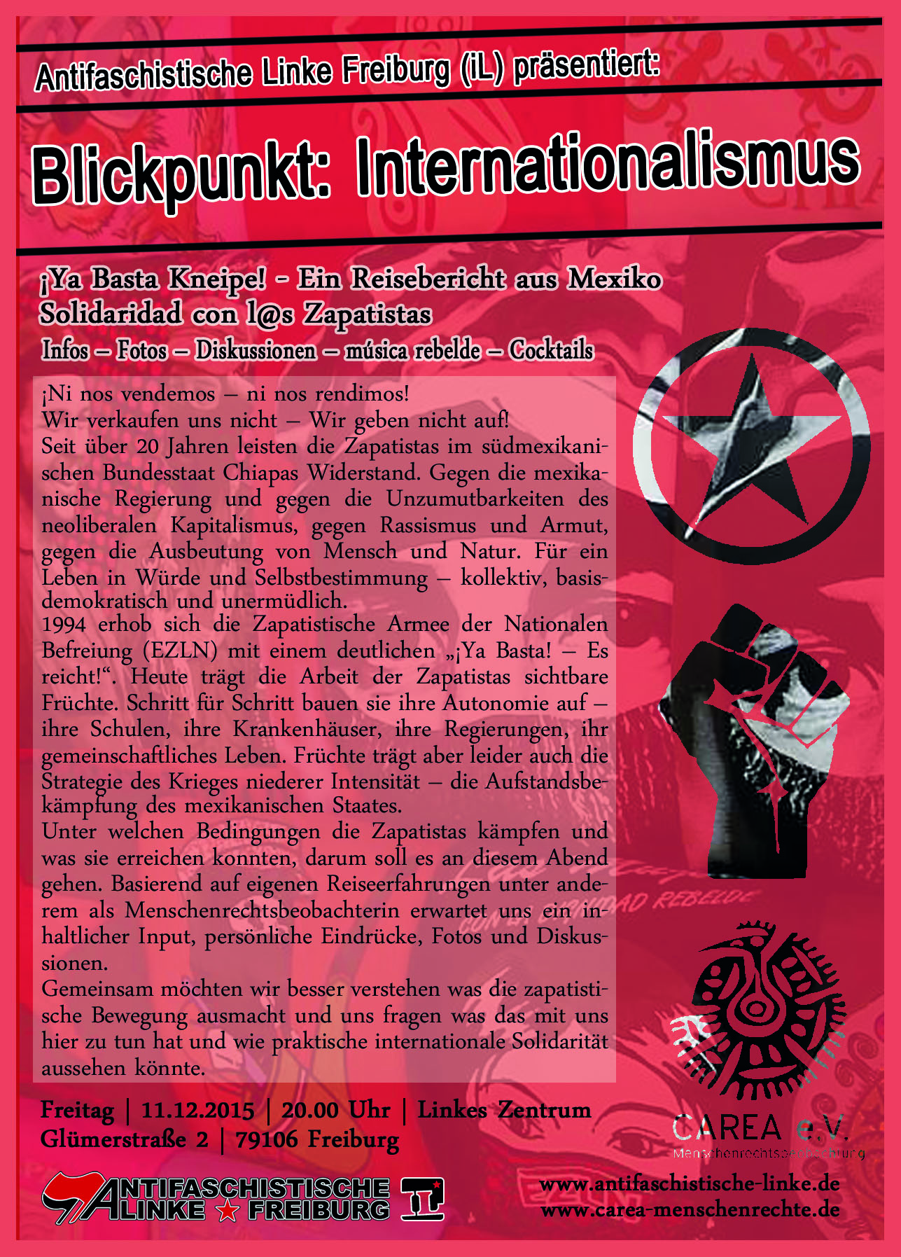Unter welchen Bedingungen die Zapatistas kämpfen und was sie erreichen konnten, darum soll es an diesem Abend gehen. Basierend auf eigenen Reiseerfahrungen unter anderem als Menschenrechtsbeobachterin erwartet uns ein inhaltlicher Input, persönliche Eindrücke, Fotos und Diskussionen. Gemeinsam möchten wir besser verstehen was die zapatistische Bewegung ausmacht und uns fragen was das mit uns hier zu tun hat und wie praktische internationale Solidarität aussehen könnte.