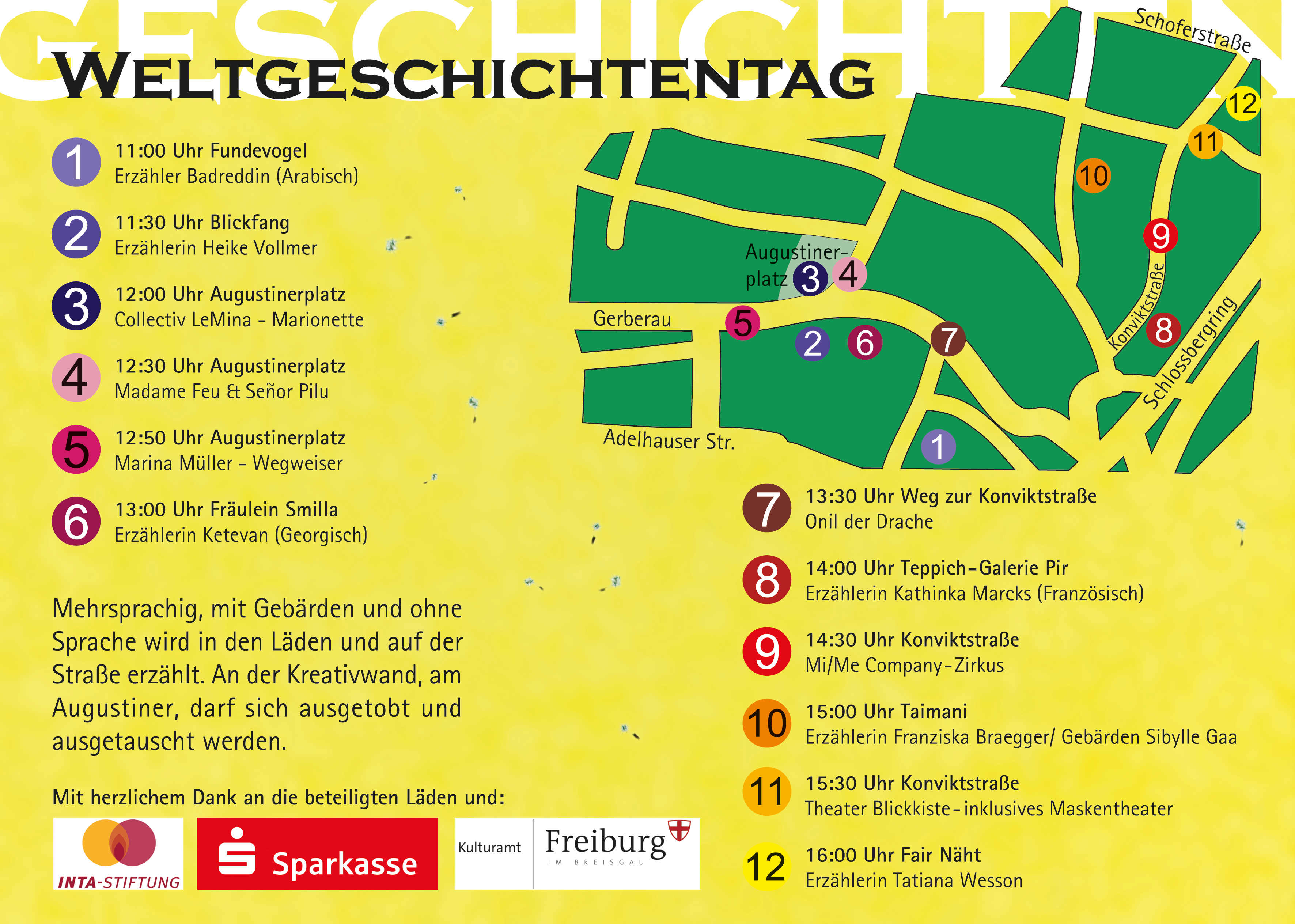 An diesem Tag werden in der Altstadt Freiburgs vom Fundevogel bis Konviktstraße in insgesamt sechs Läden sowie auf der Straße mehrsprachig, mit Gebärden und (fast) ohne Sprache Geschichten erzählt. Der Weltgeschichtentag, der seinen Ursprung 1991 in Schweden hat, wird zum ersten Mal in Freiburg von der Erzählerin Kathinka Marcks zusammen mit dem Verein mit dem Verein Ideen³ organisiert.