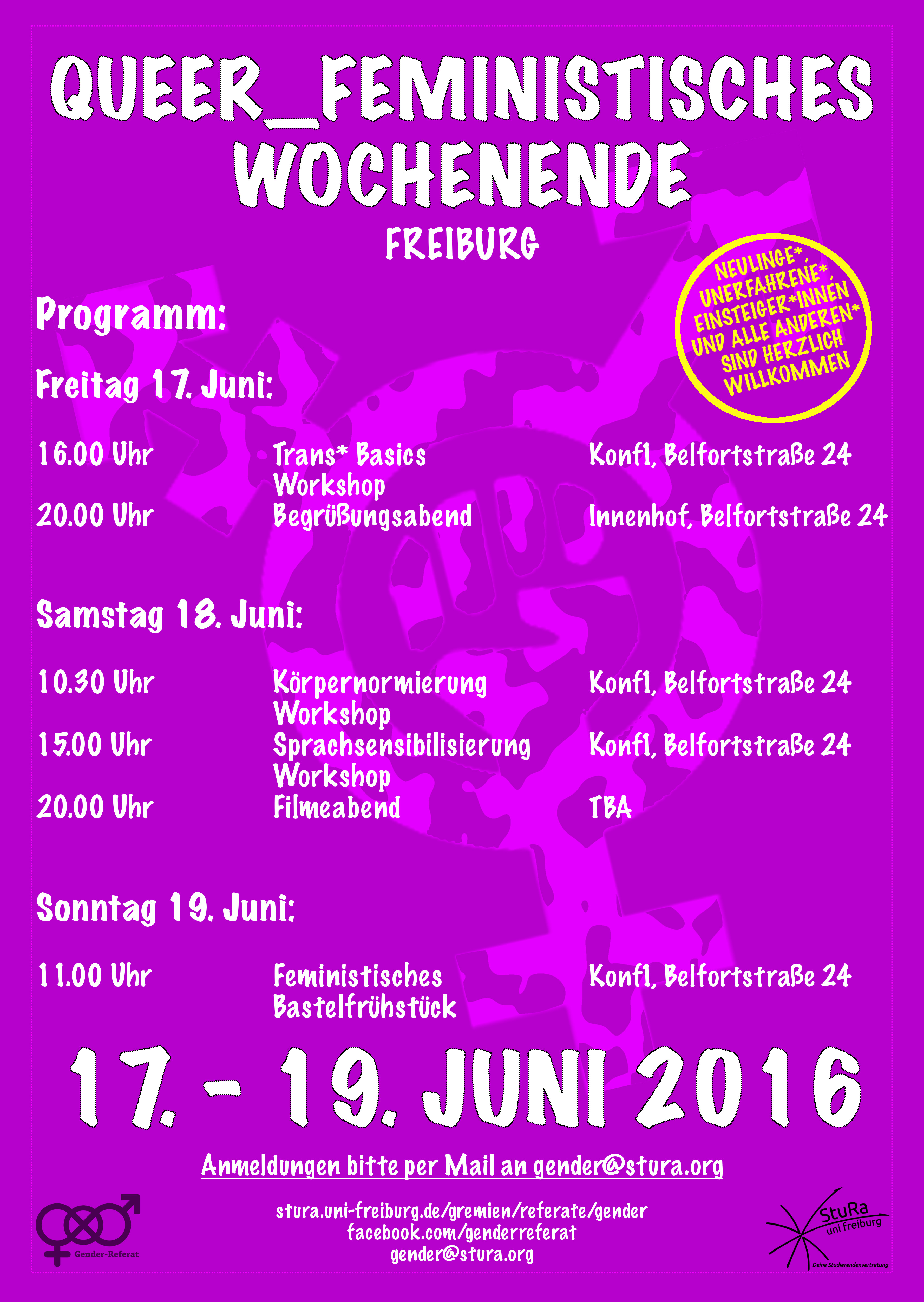 Ihr habt Lust, euch ein Wochenende mit dem Thema Gender auf verschiedenste Art und Weise auseinanderzusetzen? Ihr möchtet gerne wissen, womit das Gender-Referat des AStAs beschäftigt? Ihr beschäftigt euch schon länger mit Gender und Feminismus und wollt euer Wissen gerne vertiefen? Dann kommt gerne zum queer_feministischen Wochende des Genderreferats! =)