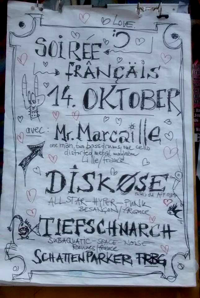 Bei den Schattenparkern ist was los. Heute 3 sympathische Bands aus dem schönen Nachbarland mit der drolligen Sprache... MR. MARCAILLE holzt alleine mit seinem ultraverzerrten Cello und zwei Bassdrums alles nieder. Eine detonierende Bombe, beim Zerfetzen dem Metal fröhnend. Schön mit Punkattitüde. Unbedingt sehenswert. DISKÖSE-ein Konglomerat des whoiswho der Besanconer Punk- und Grindgemeinde. Schön stumpf, niemals flach und immer auf die zwölf. Hossa! TIEFSCHNARCH kommen mit Theremin, Synthesizern und E-Bass. Heraus kommt eine herrliche, tanzbare Melange aus psyhedelisch-punkigen-spacig-noisigen Klängen mit nem Hang zum Wave. Herrlich.