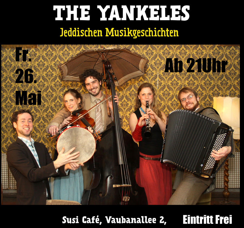 Gaunerehrlich, todglücklich und stinkunnormal, so präsentieren sich „The Yankeles“.Die charmante Klesmerkapelje fand sich 2011 an der Musikhochschule Freiburg zusammen.Infiziert durch die mitreißenden Klänge der jiddischen Musik und des bessarabischen Lebensgefühls, malen sie in Wort und Ton „eine und tausend Musikgeschichten“.Erfrischend fröhlich wird von Kühen und Onkel Yankele erzählt, der den Musikern seinen ganz eigenen Klezmer vererbt hat.Die Reise zeigt viele Gesichter einer eigenen emotionsgeladenen Klangwelt, die zum Tanzen, Träumen und Schmunzeln anregt!Inspirieren lassen sie sich dabei von allem was Klang und Namen hat. Ihre Wurzeln liegen indes im Jazz und der Klassik, doch auch die irischen und arabischen Klänge befinden sich irgendwo tief in ihrem Koffer.Herrlich lebendig und absolut authentisch zeigen „The Yankeles“ wie viel Spaß und Freude in der Welt des Klezmer steckt!