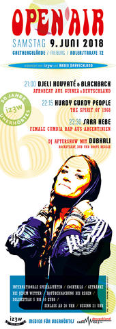 Beim gemeinsamen Open Air von iz3w und RDL spielen drei Bands, die den Spirit von 1968 auf ihre eigene Weise lebendig werden lassen. Der Afrobeat von Djeli Kouyaté & BLACKback aus Guinea und Deutschland schlägt eine musikalische Brücke zum afrikanischen Kontinent. Die Hurdy Gurdy People aus Freiburg spielen Songs von 1968 im neuen musikalischen Gewand. Die Cumbia-Rapperin Sara Hebe aus Argentinien bringt mit ihren politischen Lyrics und fetten Beats nicht nur die Bühne zum Beben. Im Anschluss spielt DJ Dubkali ein Set aus Rocksteady, Dub und Roots Reggae – alles Genres, die ihre Wurzeln im Protestpop von 1968 haben.