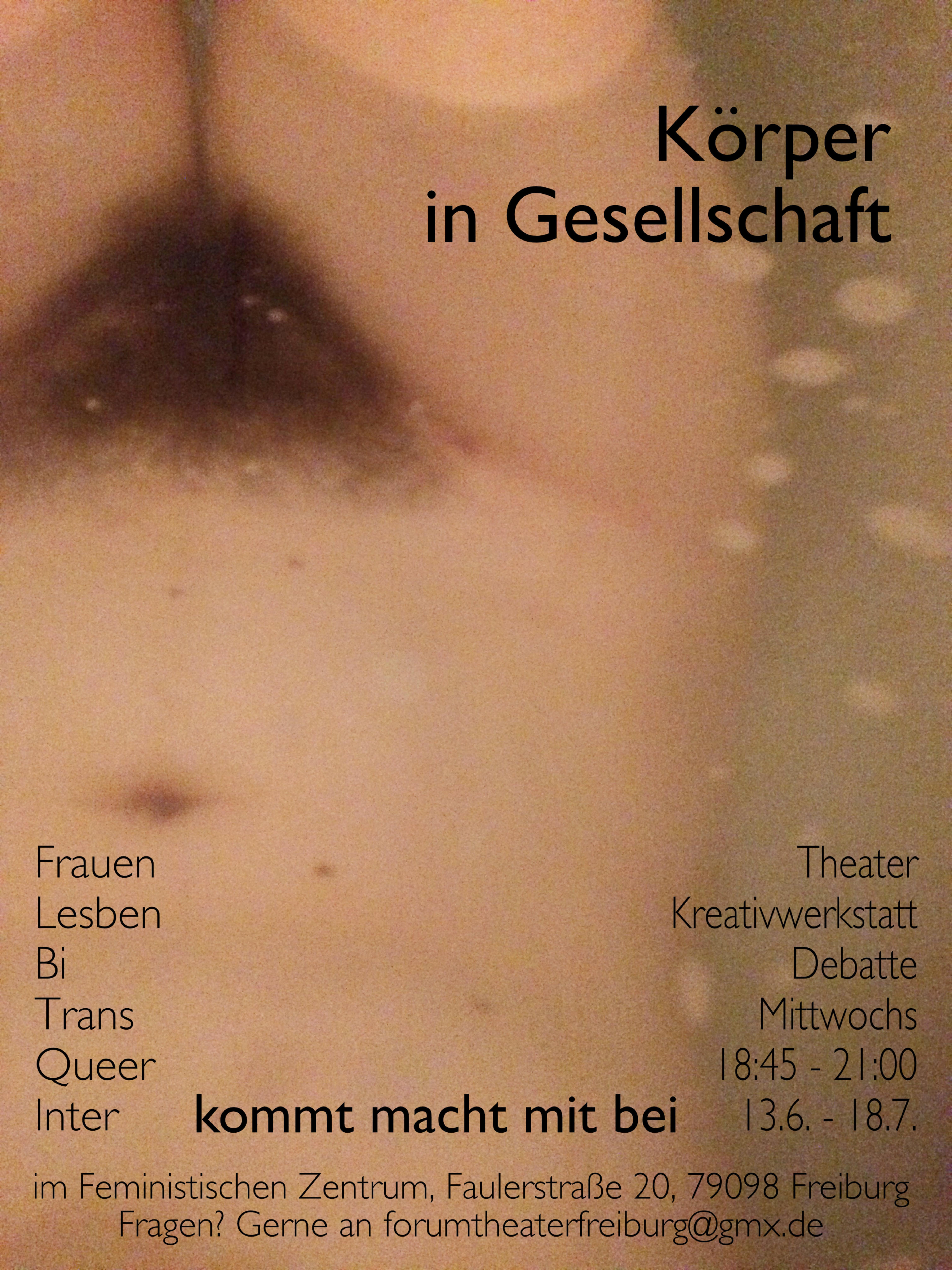 Wir werden vom 13.6. bis 18.7. ein Theaterprojekt zum Thema “Körper” machen und freuen uns noch über Frauen, Lesben, Bi, Trans, Inter, Queer, die Lust haben, an diesen 6 Terminen mitzumachen. Uns schwebt ein Straßentheater als Abschluss vor. Wir wollen uns mit Körpern, Köperbildern, unserem Verhältnis zu unserem und anderen Körpern, usw. beschäftigen. Dafür möchten wir v.a. Theatermethoden nutzen, aber auch andere kreative Ansätze wie malen, basteln, und reden. Wir werden das Projekt kollektiv angehen und jede kann sich einbringen in Vorbereitung und Durchführung.