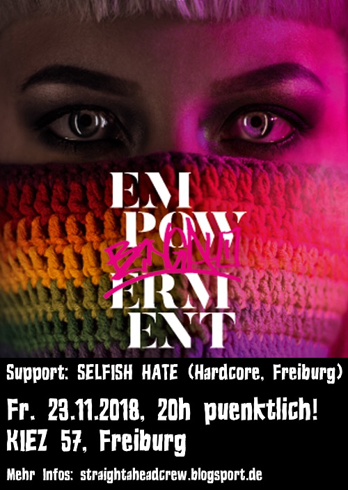 Empowerment – derzeit Stuttgarts unumstrittene Hardcore-Band Nr. 1 – kommen im Rahmen ihrer „Bengalo“-Tour zum ersten Mal nach Freiburg. Empowerment sind kompromissloser Hardcore-Punk: stilistisch eindeutig orientiert an den Klassikern des New York Hardcore: So weisen die Stuttgarter deutliche Parallelen zu den New Yorker Hardcore-Pionieren Merauder in ihrer „Masterkiller“-Ära auf. Andere Einflüsse, auf die sich Empowerment berufen, sind frühe deutsche Punkrockbands wie Slime. Dass Empowerment stets die Grenzen des Genres aufzeigen und über diese auch hinauslinsen, misst sich auch daran, dass sie – entgegen der sonst üblichen Praxis im Hardcore-Bereich hierzulande – nahezu ausschließlich auf Deutsch singen.