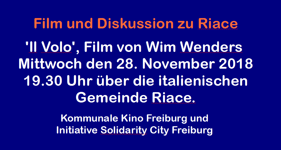 Nach der Demonstration ‚Solidarität mit Riace‘ am 10. November 2018 in Freiburg zeigen wir den Film ‚Il Volo‘ am Mittwoch 28. November 2018, 19.30 Uhr im Kommunalen Kino Freiburg