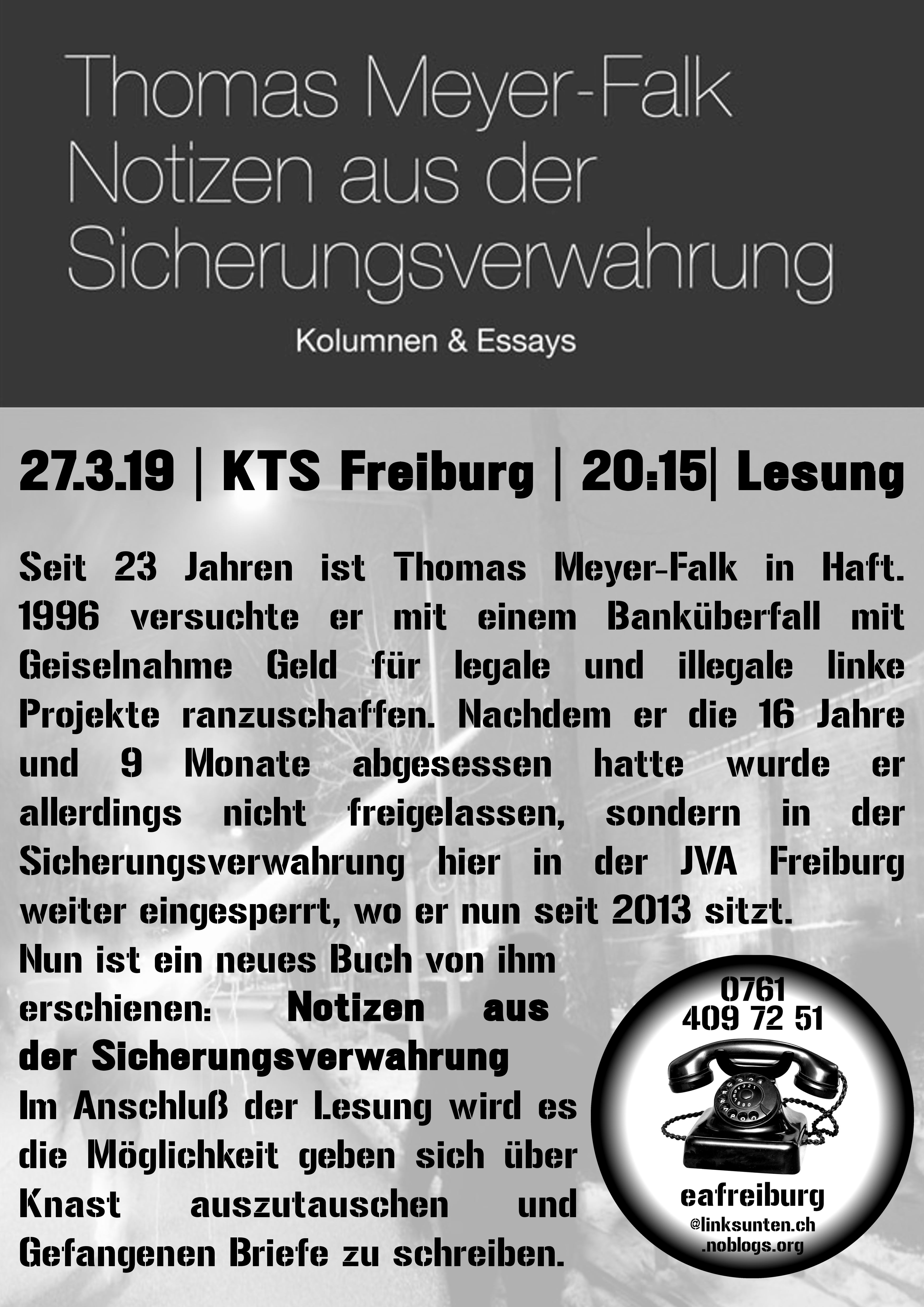 Seit 1996 ist Thomas Meyer-Falk in Haft. Damals versuchte er mit einem Banküberfall mit Geiselnahme Geld für legale und illegale linke Projekte ranzuschaffen. erst in isohaft in stuttgart stammheim bis frühling 1998, dann etwas -gelockert- im bayrischen straubing, im herbst 1998 in isohaft in bruchsal. 2000 und 2004 erfolgten weitere verurteilungen wegen nötigung, beleidigungen, bedrohungen - wie die juristen es nennen - -zum nachteil- von vollzugsjuristen, richtern, staatsanwälten, sowie ein paar politikern (u.a. bundeskanzler schröder, bayrischer innenminister beckstein, hessischer ministerpräsident koch). Er wurde zu insgesamt 16 Jahre und 9 Monate verurteilt. Seit 2013 ist er in Sicherungsverwahrung hier in der JVA Freiburg, von den dort lebenden auch Totenhaus genannt. Totenhaus weil die meisten nur durch den Tod aus der Sicherungsverwahrung rauskommen.