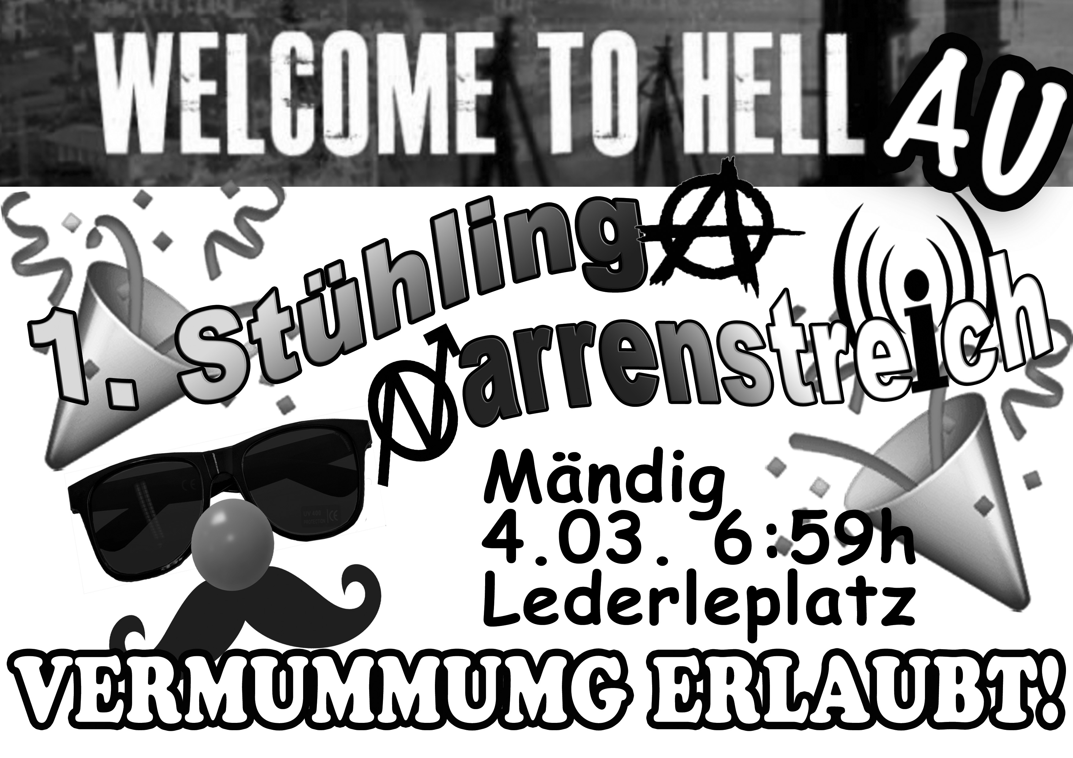 Beteiligt euch am Widerstand gegen die Welt von Eigentum und Spekulation. Reiht euch ein in den 1. Stühlinger Narrenstreich – ziehen wir miteinander lautstark über Stock und Stein.