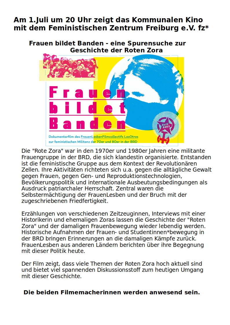 Erzählungen von verschiedenen Zeitzeuginnen, Interviews mit einer Historikerin und ehemaligen Zoras lassen die Geschichte der "Roten Zora" und der damaligen Frauenbewegung wieder lebendig werden. Historische Aufnahmen der Frauen- und Studentinnen*bewegung in der BRD bringen Erinnerungen an die damaligen Kämpfe zurück. FrauenLesben aus anderen Ländern berichten über ihre Begegnung mit dieser Politik heute.