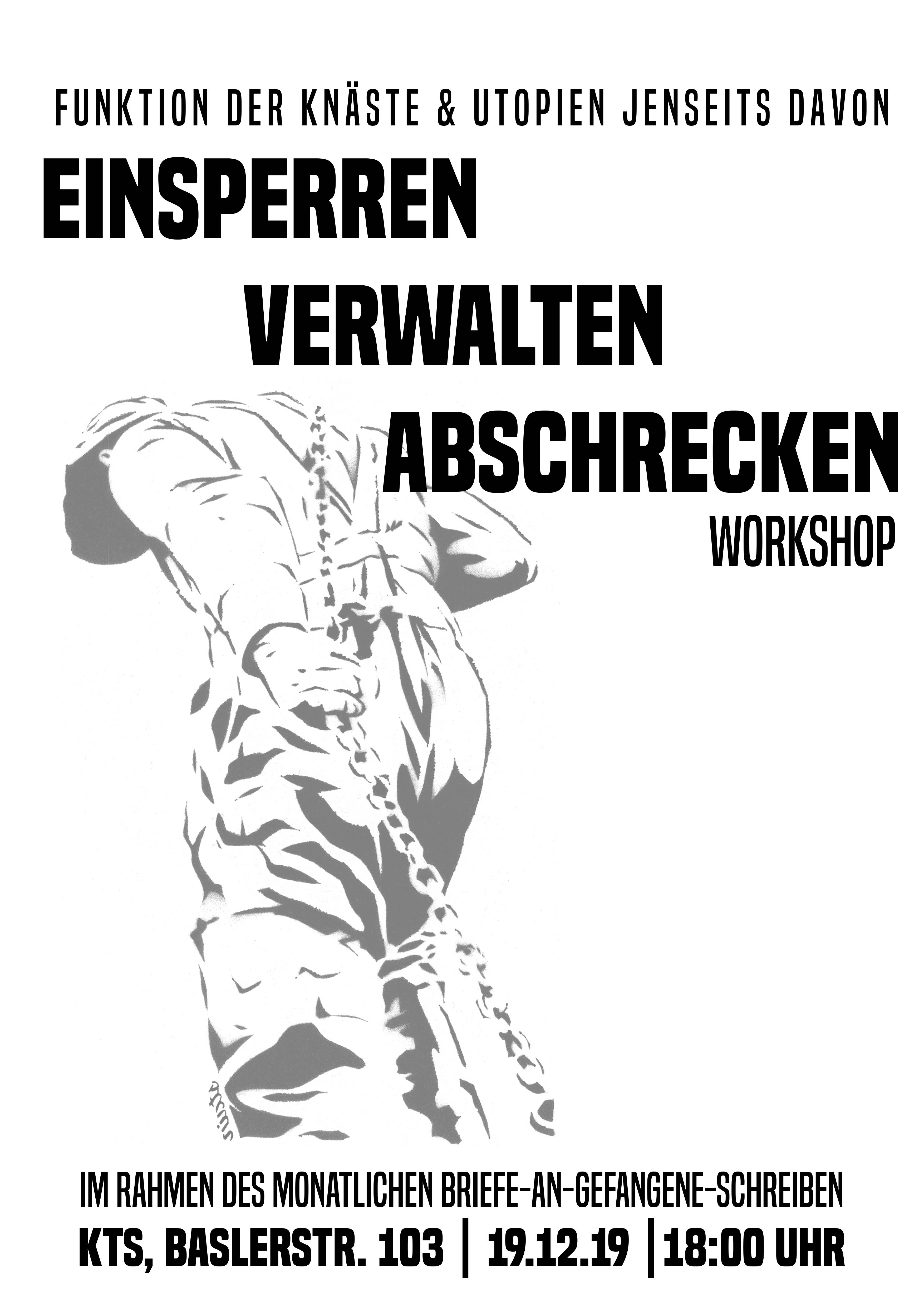 Darüber wollen wir mit euch diskutieren und uns fragen: warum gibt es Knäste, was ist deren Funktion? Wie hängen soziale Konditionierung, staatlicher Machterhalt und die Idee des Einsperrens zusammen? Und was sind unsere Utopien einer freieren Gesellschaft?