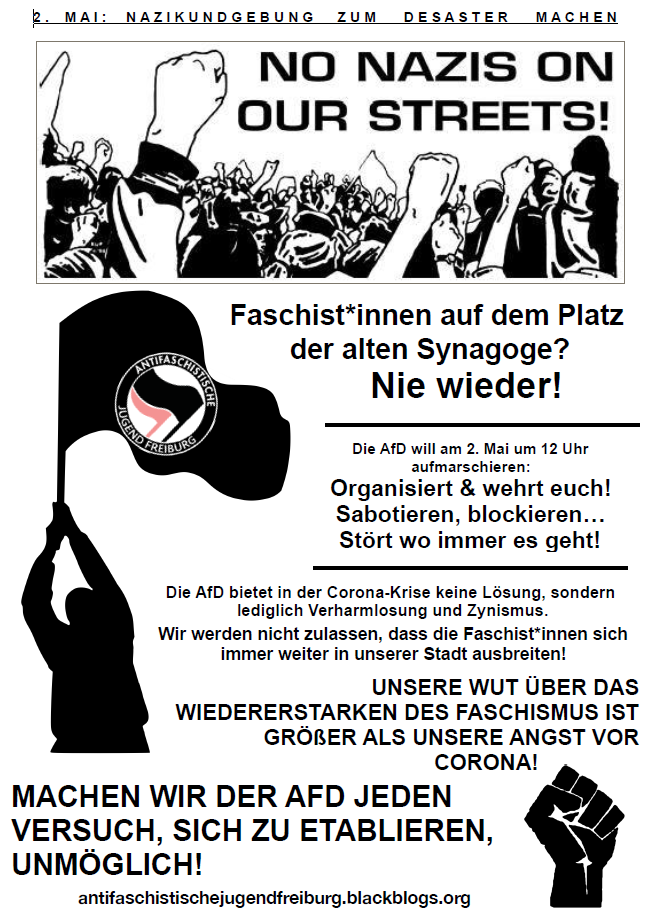 Der Freiburger Stadtrat Dubravko Mandic und seine neofaschistische AfD rufen genau 87 Jahre nach der Zerschlagung der freien Gewerkschaften zu einer Demonstration zum Schutz der „deutschen Grundrechte“ am Platz der alten Synagoge auf. In einem YouTube-Video kündigt er eine „Demo für das Leben“ an und will damit die Forderung der AfD-Stadtratsfraktion nach einer sofortigen „Aussetzung des Shutdowns“ provokant auf dem zentralsten Platz in Freiburg in die Öffentlichkeit tragen. Dass dieser Ort eine historische Bedeutung in sich trägt, sollte wohl jede*m bewusst sein.