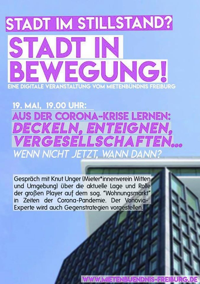 Die Veranstaltung findet am Dienstag, 19. Mai um 19.00h mit Knut Unger zum Thema „Deckeln, Enteignen, Vergesellschaften... wenn nicht jetzt wann dann?“ statt.