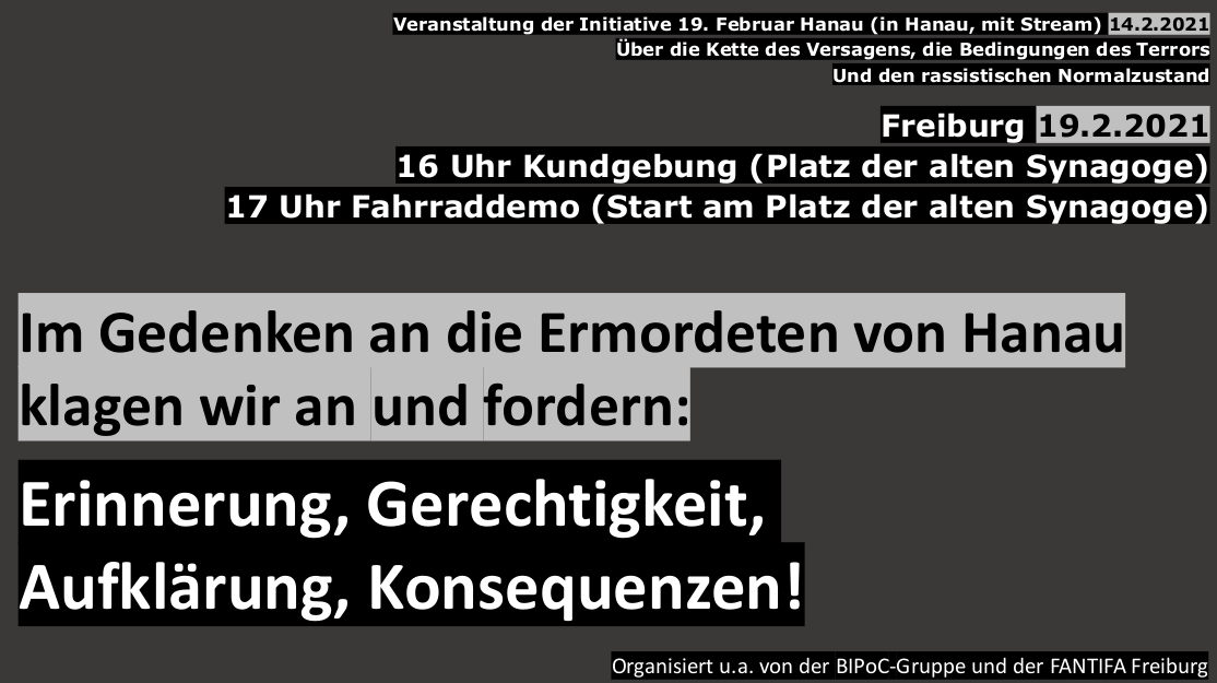 Gedenk-Kundgebung mit anschließender Fahrrad-Demo am 19. Februar 2021 in Freiburg um 16 Uhr auf dem Platz der Alten Synagoge (unter Einhaltung aller Infektionsschutzmaßnahmen)