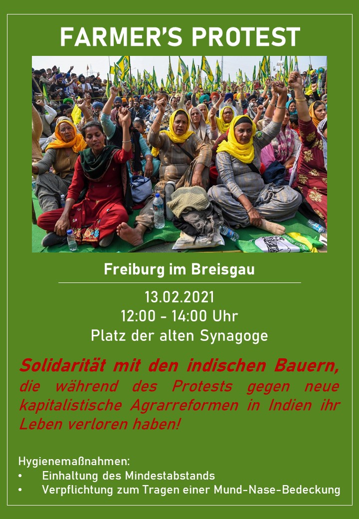 Die Demo wird von einer Gruppe indischer Studierender in Freiburg organisiert und solidarisiert sich mit den Menschen, die während den Protesten verstorben sind, und steht gegen die geplanten Agrarreformen in Indien!