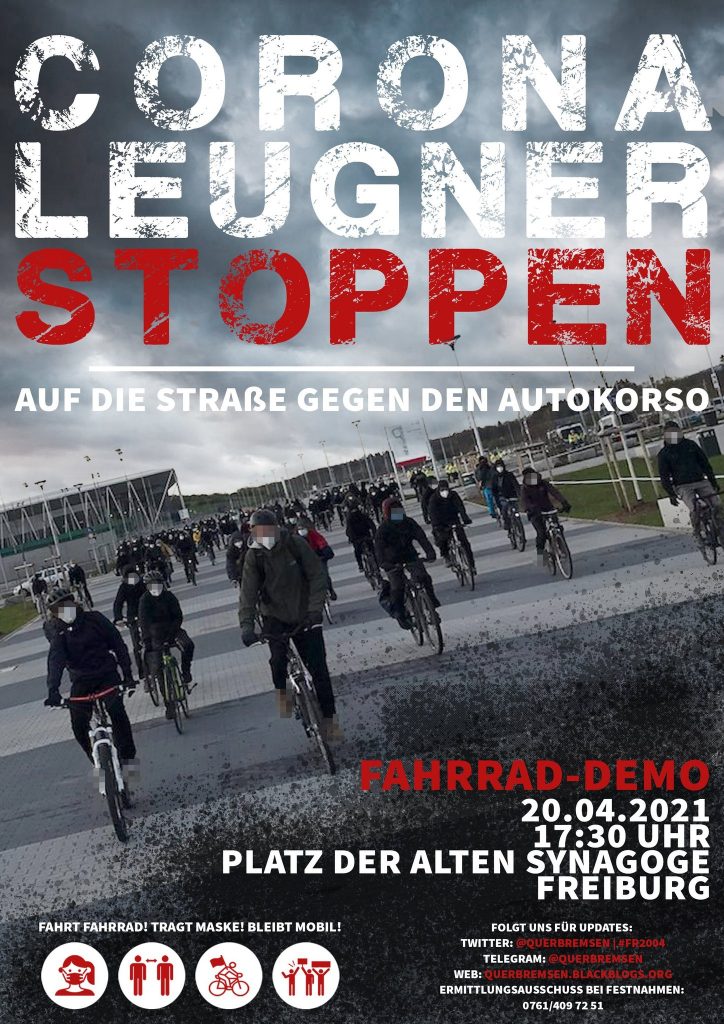 Freiburg! Am Dienstag ist wieder der Autokorso der Corona Leugner:innen unterwegs. Wie die vergangenen Wochen zeigten, werden unter ihnen wieder einige gewaltbereite Rechte sein. Daher fahren wir gemeinsam aus der Innenstadt in Richtung Startpunkt des Korsos.