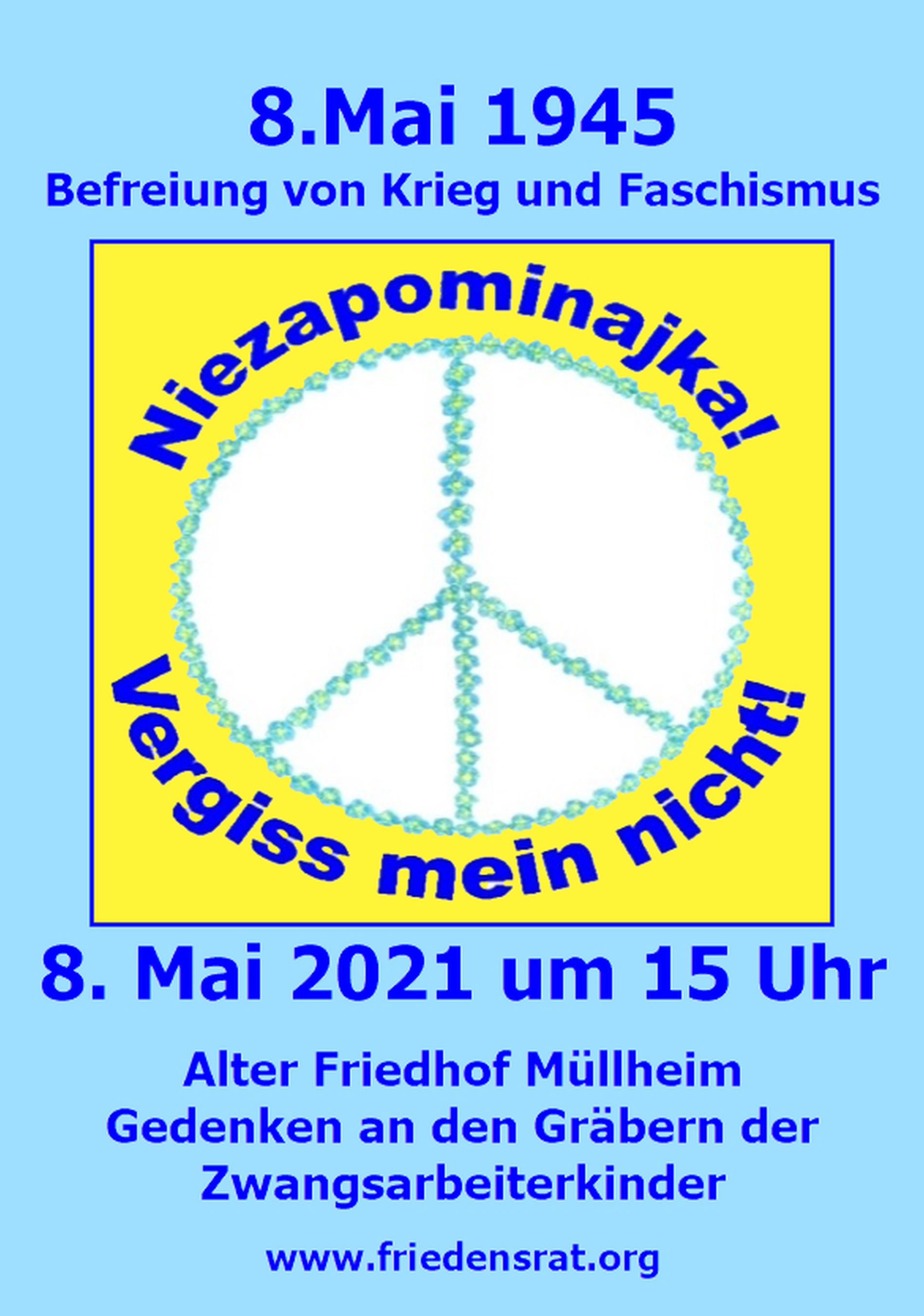 Deshalb lädt der Friedensrat Markgräflerland - unter Beachtung der aktuellen Coronamaßnahmen wie Mundschutz und Abstandshaltung - ein zur Erinnerung an die doppelte Befreiung von Faschismus und Krieg an den Gräbern der Zwangsarbeiterkinder auf dem Alten Friedhof in Müllheim am Samstag, 8. Mai 2021 um 15 Uhr: Niezapominajka! - Vergiss mein nicht!
