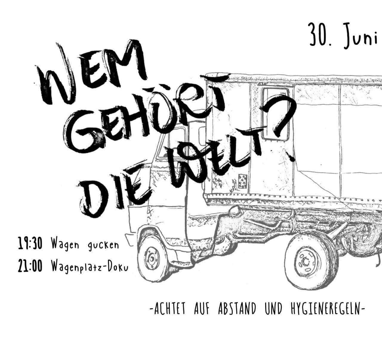Das Wagenkollektiv Radlager öffnet am 30. um 1930 ein paar ihrer fahrbaren Zuhause, lädt zum Rumhängen ein (bitte beachtet die üblichen Hygiene Regeln) und zeigt um 2100 eine richtig knorke Doku über den Wagenplatz „Wem gehört die Welt?“