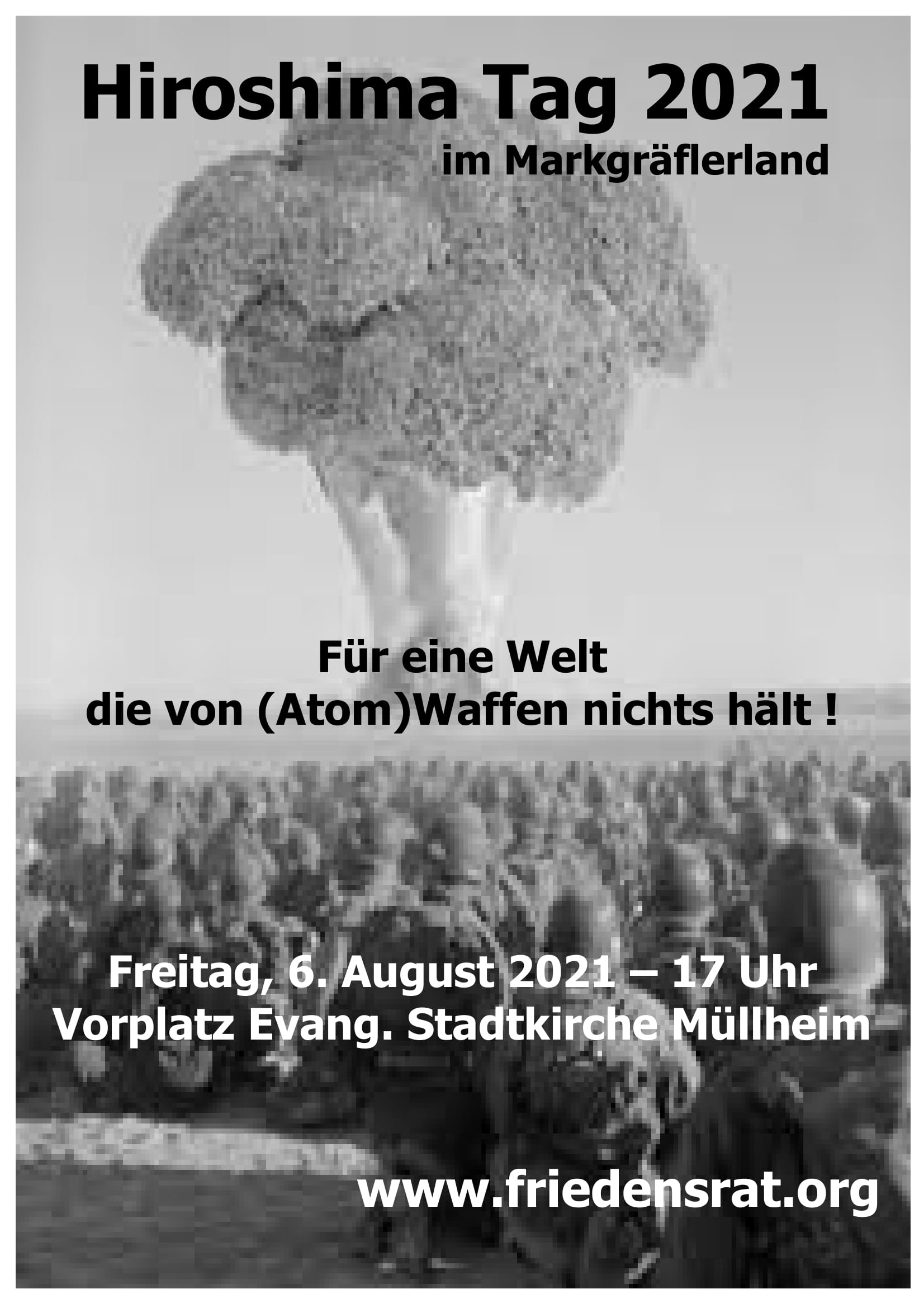 Der Friedensrat Markgräflerland lädt am Hiroshioma Tag am 6. August 2021 um 17 Uhr zu einer Kundgebung für eine Welt in Frieden ohne Atomwaffen auf den Vorplatz der Evang. Stadtkiche in der Werderstr. in Müllheim ein.