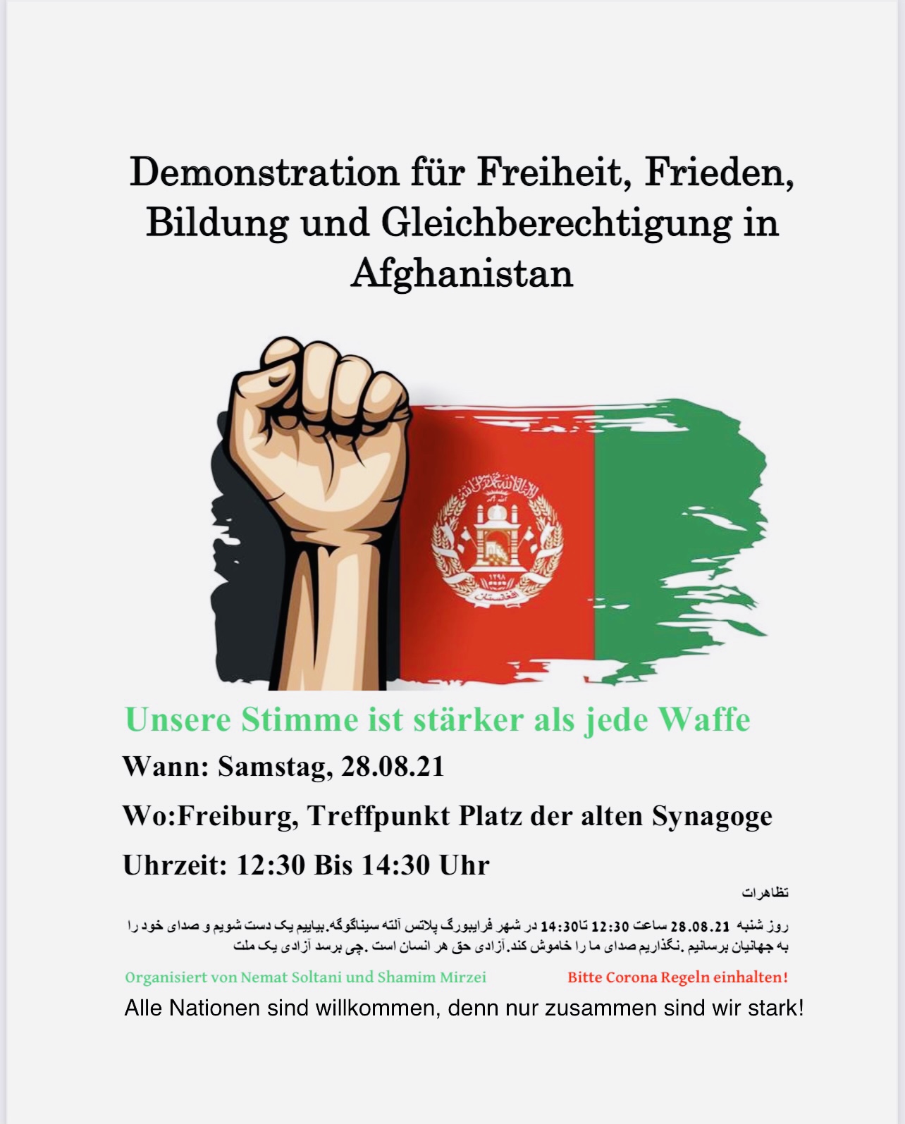 Samstag, 28.08.21 um 12:30 Uhr - 14:30 Platz der Alten Synagoge Platz der Alten Synagoge 79098 Freiburg im Breisgau Deutschland Show map unsere Stimme ist stärker als jede Waffe Themen Flucht und Grenzen Krieg und Militarisierung Soziale Kämpfe Transnationale Solidarität Type of Event Demonstration