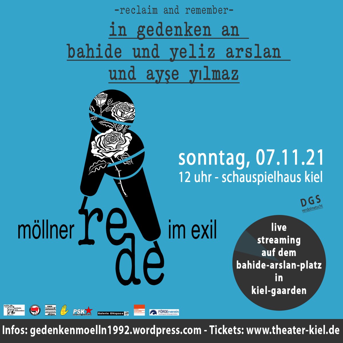 Ayşe Yılmaz, Yeliz ve Bahide Arslan 23 Kasım 1992’de Mölln’de ırkçı bir kundaklama saldırısında katledildiler. Onların anısına „Sürgünde Mölln Konuşması“ yapılıyor. Bu konuşma 2013’ten beri Mölln şehrinin resmi anma töreninin bir parçası değil. Katledilenlerin ailelerinin konuşmacıları kendilerinin seçmesi artık arzu edilmiyordu. O zamandan beri konuşma farklı yerlerde “sürgünde” yapılıyor.