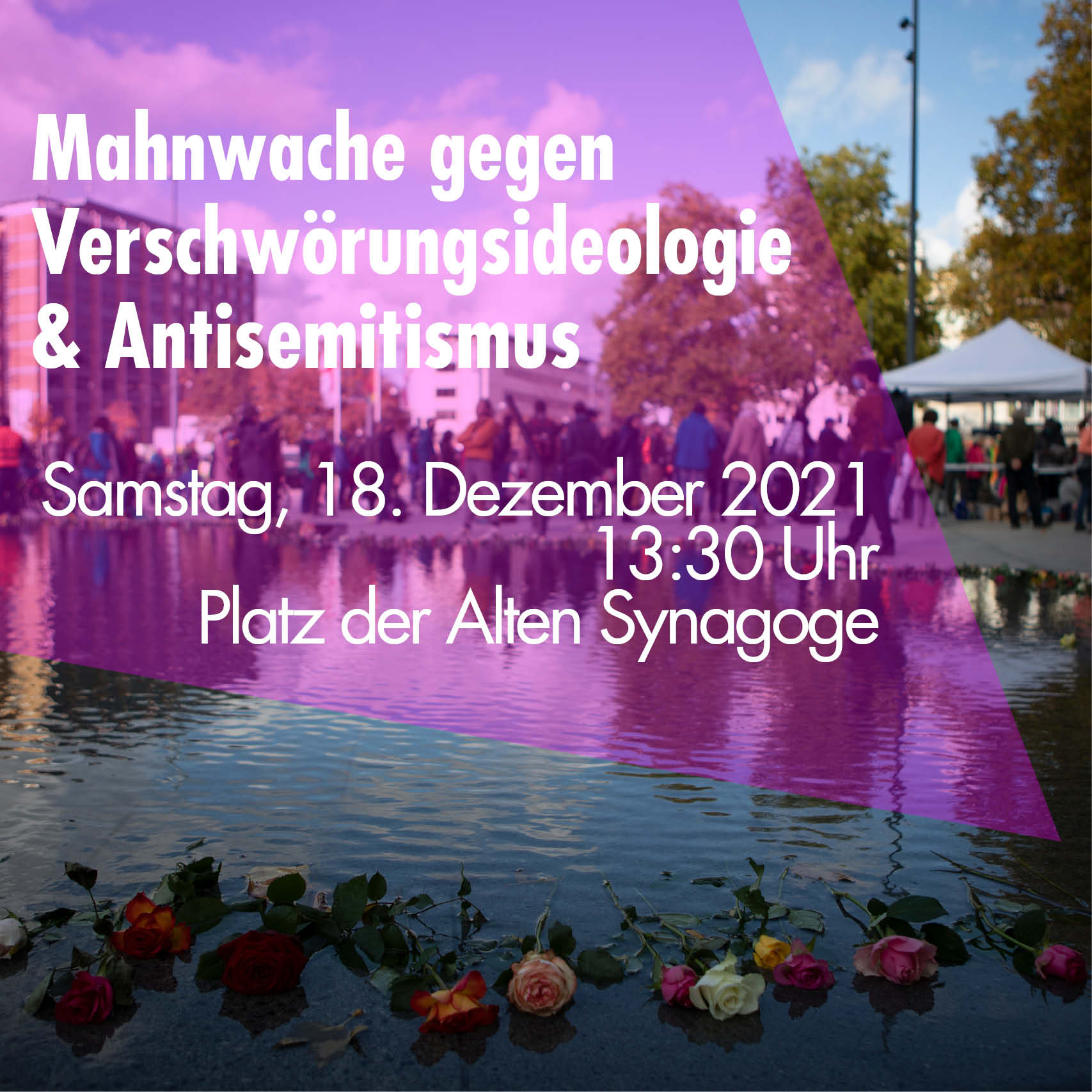 Kommt deshalb alle am Samstag, den 18.12.2021, um 13:30 Uhr auf den Platz der Alten Synagoge zur Mahnwache gegen Verschwörungsideologie und Antisemitismus!