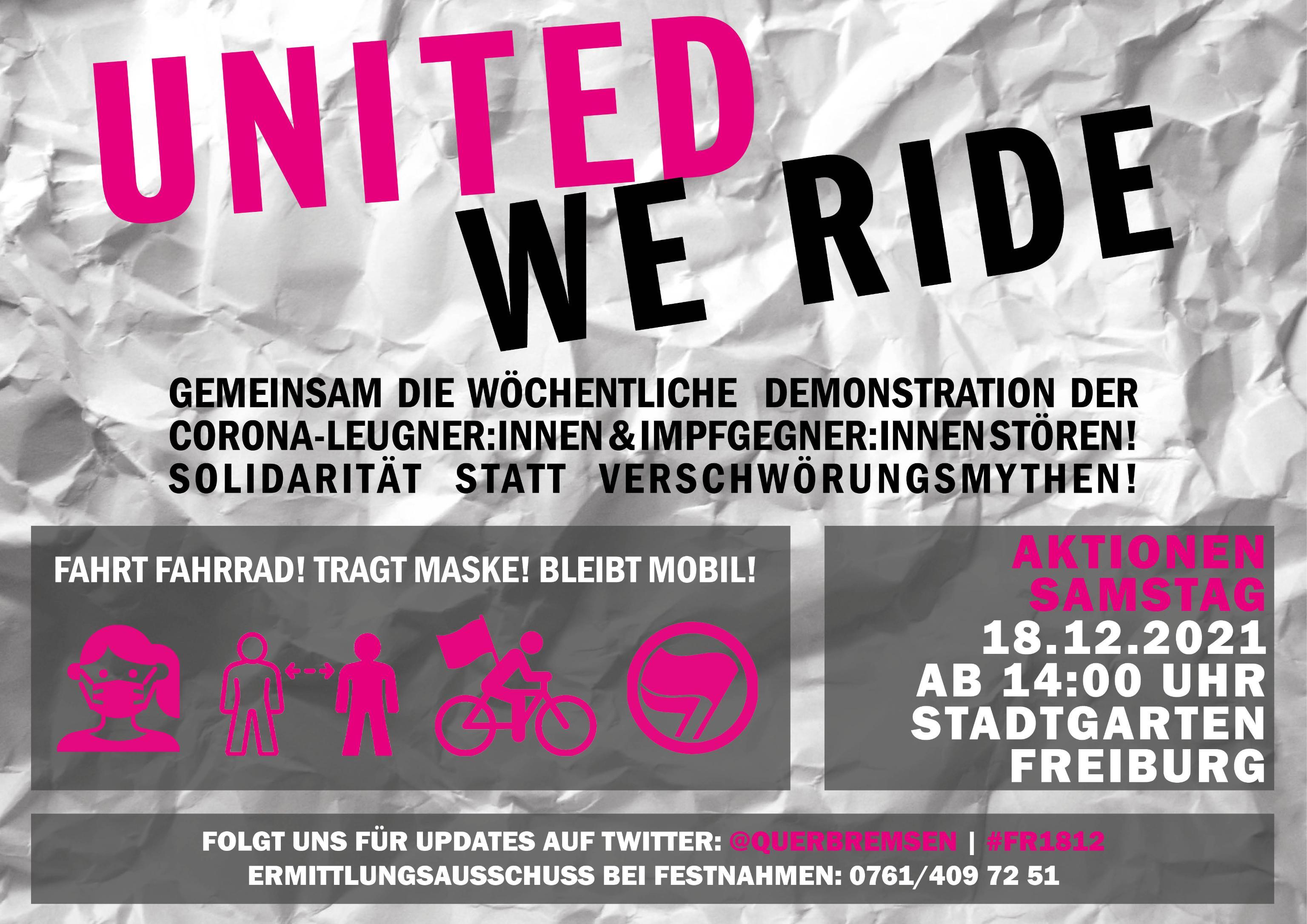 Als Querdenken ausbremsen rufen wir euch dazu auf, am 18. Dezember, ab 14:00 Uhr zahlreich zum Stadtgarten in Freiburg kommen. Bildet Bezugsgruppen, kommt mit dem Rad, bleibt mobil und passt aufeinander auf!