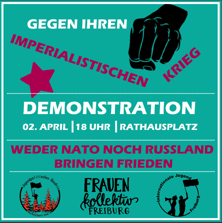 Im Zuge des bundesweiten Aktionstag des Nicht-Auf-Unseren-Rücken-Bündnisses „Ihre Kriege nicht auf unserem Rücken“ rufen wir zu einer antiimperialistischen Antikriegsdemo am Samstag den 02.04. ab 18 Uhr auf dem Rathausplatz auf: