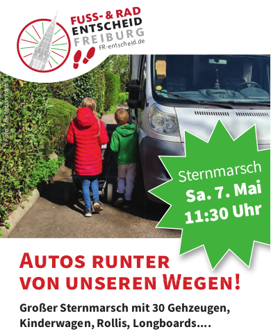 Wir protestieren dagegen ganz entschieden und starten am Samstag, 7. Mai um 11:30 Uhr an unterschiedlichen Orten in Freiburg einen großen Sternmarsch mit insgesamt ca. 30 Gehzeugen (die jeweils die Fläche eines großen Autos einnehmen), Rollstühlen, Kinderwagen, Inline-Skates und Longboards, Einrädern, Rollkoffern... und treffen uns alle um ca. 13 Uhr auf der Rempartstraße zur Kundgebung.