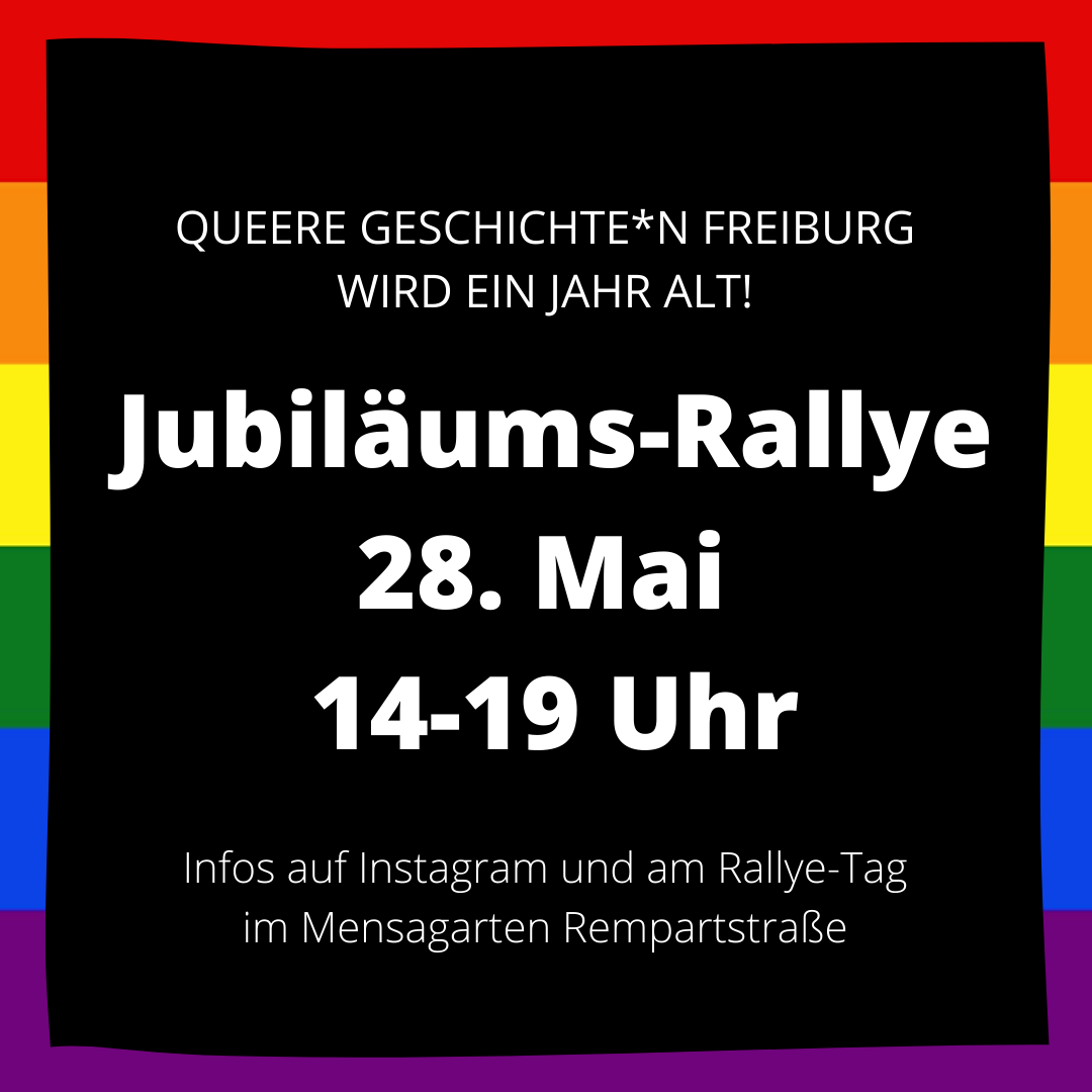 Der queere Audioguide Freiburgs wird eins! Am 28. Mai von 14 bis 19 Uhr feiern wir das mit einer Jubliäums-Rallye que(e)r durch die Stadt. Alle sind herzlich eingeladen! Und so könnt ihr mitmachen: