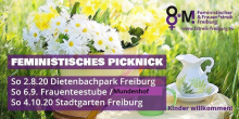 Feministisches Picknick Sonntag, 02.08.20 um 15:00 Uhr - So., 02.08.2020 - 17:00 Sonntag, 06.09.20 um 15:00 Uhr - So., 06.09.2020 - 17:00 Sonntag, 04.10.20 um 15:00 Uhr - So., 04.10.2020 - 17:00 des Feministischen und Frauen*streik Bündnis Freiburg an wechselnden orten - siehe text