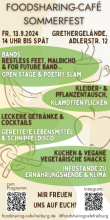 foodsharing-Sommerfest Freitag, 13.09.24 um 14:00 Uhr - Sa., 14.09.2024 - 01:00 Live-Musik, Schnippeln, Infostände, Kleider- und Pflanzentausch. Strandcafé Grether Innenhof