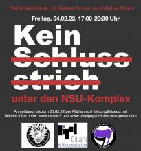 [online] Workshop ‚Kein Schlussstrich unter den NSU-Komplex‘ Freitag, 04.02.22 um 17:00 Uhr - Fr., 04.02.2022 - 20:30 mit Referent*innen der Initiative BiLaN online, Anmeldung bis 01.02.!