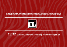 IL-Kneipe Freitag, 13.12.19 um 20:30 Uhr - Sa., 14.12.2019 - 00:00 Die IL-Kneipe im Linken Zentrum Freiburg ¡adelante!. Musik, Drinks und die Gelegenheit mit der Interventionistischen Linken ins Gespräch zu kommen. Linkes Zentrum Freiburg (LiZ)