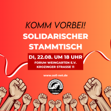 Solidarischer Stammtisch vom Solidaritätsnetzwerk Dienstag, 22.08.23 um 18:00 Uhr Das Solidaritätsnetztwerk lädt ein sich in freundlicher Athmossphäre auszutauschen Stadtteilbüro Forum Weingarten