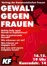 Vortrag und Diskussion: Gewalt an Frauen gemeinsam und entschlossen entgegentreten! Freitag, 16.12.22 um 19:00 Uhr - Fr., 16.12.2022 - 21:00 Vortrag und Diskussion mit den Kommunistischen Frauen ganz woanders Konradstraße 14
