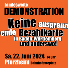Landesweite Demo in Pforzheim: Gegen soziale Ausgrenzung, Abschiebungen und Rassismus. Keine ausgrenzende Bezahlkarte! Solidarität mit Geflüchteten, Bürgergeldempfänger*innen, Arbeits- und Wohnungslosen. Samstag, 22.06.24 um 10:00 Uhr - Sa., 22.06.2024 - 20:00 Kein ausspielen gesellschaftlicher Gruppen gegeneinander. Sozialleistungen sind keine Almosen, sondern überlebensnotwendig. Sie müssen bedingungslos gewährt werden. Keine Einführung einer ausgrenzenden Bezahlkarte, für niemanden. Hauptbahnhof Freiburg