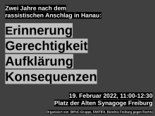 Say their names! Samstag, 19.02.22 um 11:00 Uhr Kundgebung am 19. Februar um 11 Uhr am Platz der Alten Synagoge Platz der Alten Synagoge