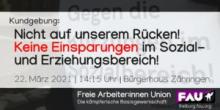 Nicht auf unserem Rücken! Keine Einsparungen im Sozial- und Erziehungsbereich! Montag, 22.03.21 um 14:15 Uhr Kundgebung zu der Tariferhöhung im Sozial- und Erziehungsdienst