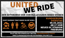 Autokorso der Corona-Leugner:innen ausbremsen Dienstag, 09.03.21 um 17:00 Uhr Organisiert euch in Kleingruppen und überlegt euch Aktionen! Am neuen SC-Stadion
