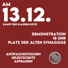 Antifaschistische Demonstration am 13.12. Dienstag, 13.12.22 um 18:00 Uhr - Di., 13.12.2022 - 19:00 Demonstration zur Urteilsverkündung im Hagerman Prozess: Kampf der Klassenjustiz! Platz der Alten Synagoge
