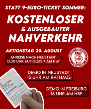 Für kostenlosen & ausgebauten Nahverkehr - Demo in Freiburg Samstag, 20.08.22 um 18:00 Uhr - Sa., 20.08.2022 - 19:00 Statt 9-Euro-Ticket Sommer: Kostenloser Nahverkehr für Alle! Hauptbahnhof Freiburg