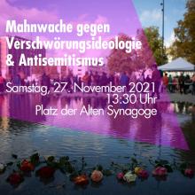 GEÄNDERTE UHRZEIT: Mahnwache gegen Verschwörungsideologie und Antisemitismus Samstag, 27.11.21 um 13:30 Uhr - Sa., 27.11.2021 - 16:00 Am Denkmal der zerstörten Synagoge Platz der Alten Synagoge