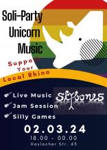 Soli-Party im Unicorn Music Store Samstag, 02.03.24 um 18:00 Uhr - Sa., 02.03.2024 - 23:59 Soli-Party mit Konzert, Jam Session und Spiele ganz woanders