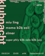 Klubnacht w/ Miu Ling, MOMO B2B AZIL, Elmar & Juju B2B Superphly B2B Zalo Freitag, 09.02.24 um 23:00 Uhr - Samstag, 10.02.24 um 05:00 Uhr next Klubnacht at ArTik Freiburg. Food provided by "Solitopf - Ein Umverteilungsprojekt für Menschen mit Fluchterfahrung" ArTik // Freizeichen